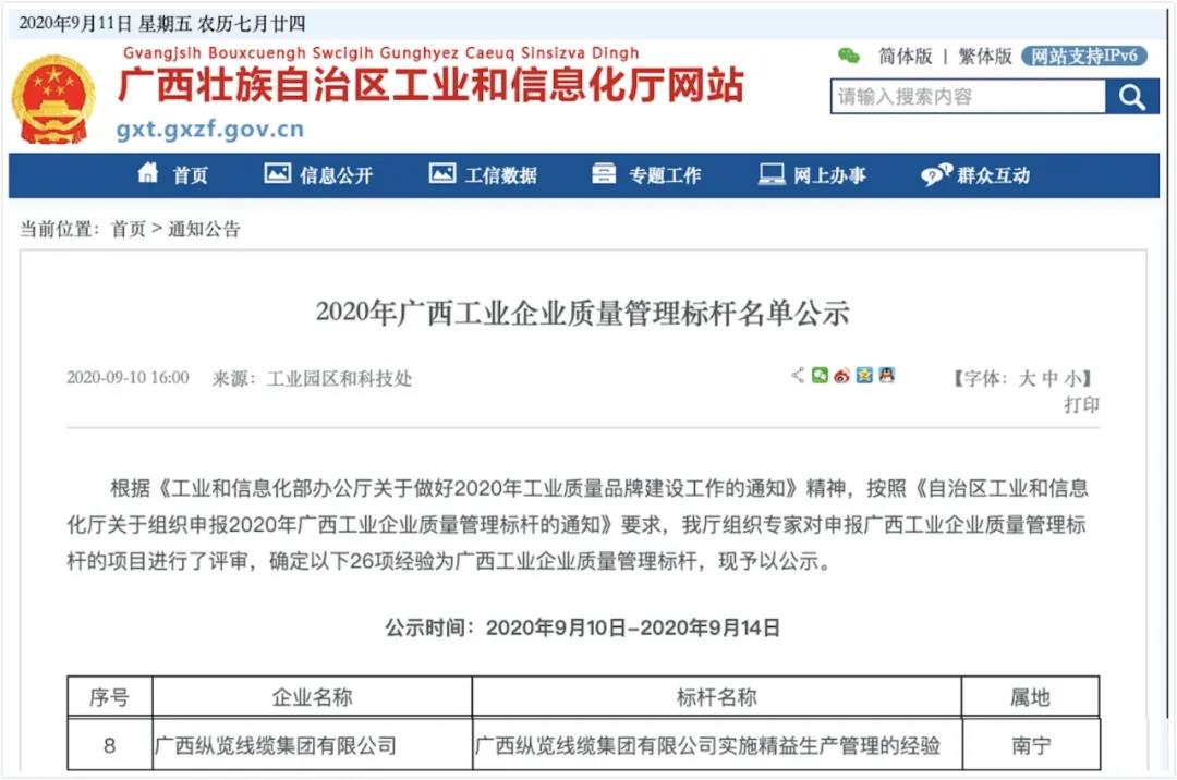 9月10日,自治區(qū)工業(yè)和信息化廳公布2020年廣西工業(yè)企業(yè)質(zhì)量管理標(biāo)桿名單,《廣西縱覽線纜集團有限公司實施精益生產(chǎn)管理的經(jīng)驗》成為廣西工業(yè)企業(yè)質(zhì)量管理標(biāo)桿名列其中。